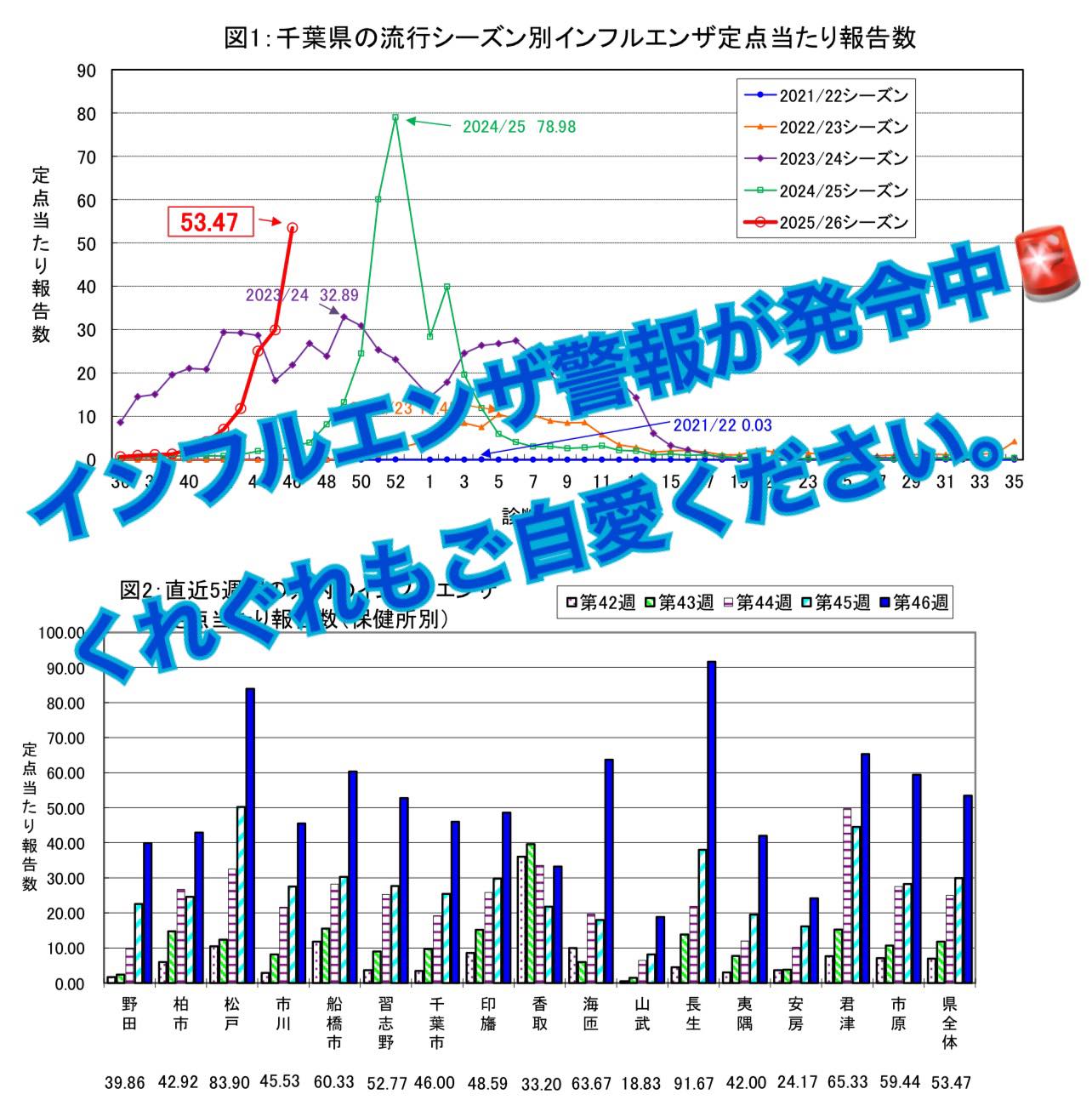 県内の定点医療機関あたりの患者数は 53.47人(警報基準30人)と、高い水準で推移しています。
