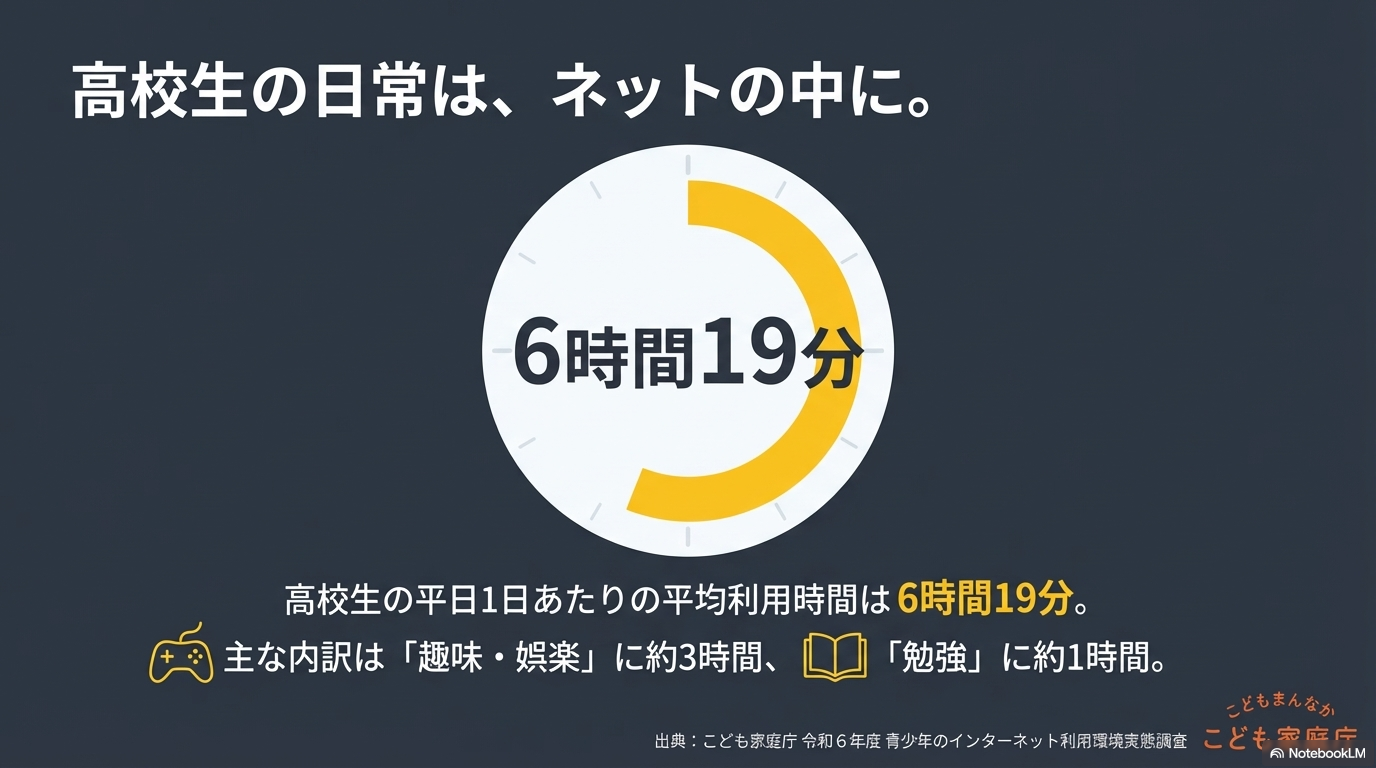 こども家庭庁が令和6年度に実施した調査では、小中高生の平日のネット利用時間は平均5時間2分と、過去最高を記録しました。スマホの所有率は中学生で81.5%、高校生では98.7%に達しています。