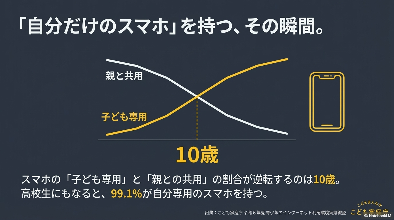 10歳前後で「親と共用」から「自分専用」のスマホへと移行し、高校生になると99.1%が自分専用端末を持つに至ります。