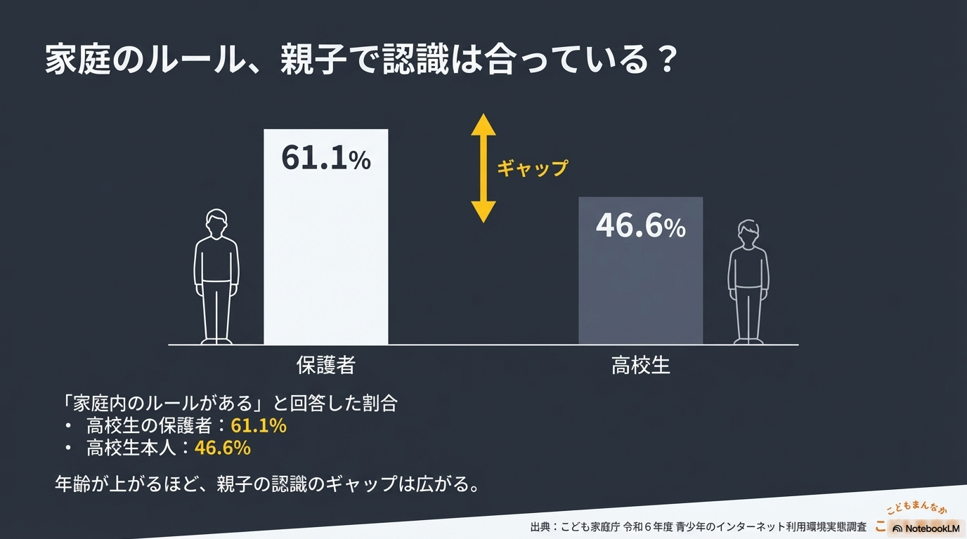 同じ質問に対し、高校生本人で「ルールがある」と認識している割合は46.6%にとどまりました。