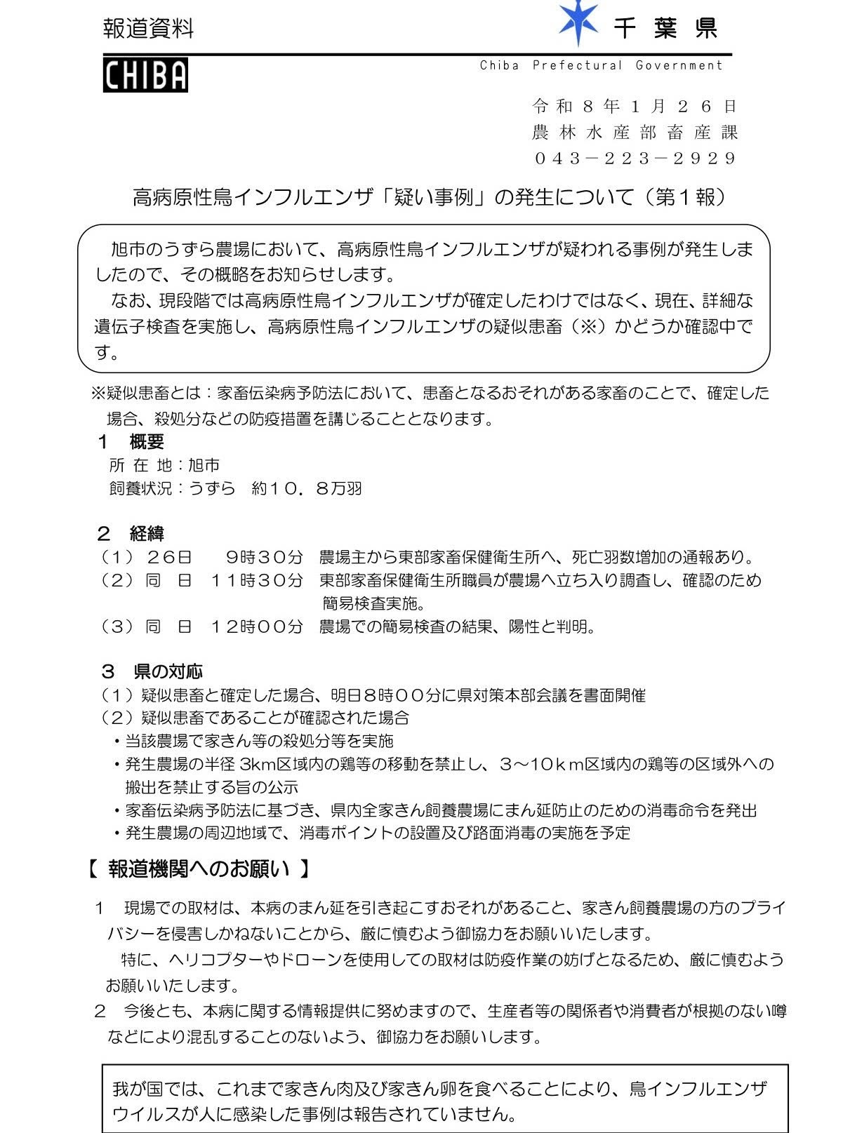 あわせて、旭市のうずら農場において高病原性鳥インフルエンザが疑われる事例が確認されたとの報告を受けました。農場では死亡羽数の増加を受け、家畜保健衛生所が立ち入り調査を実施し、簡易検査で陽性が確認されています。