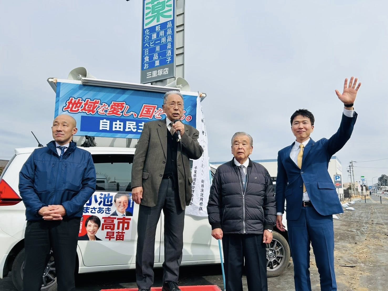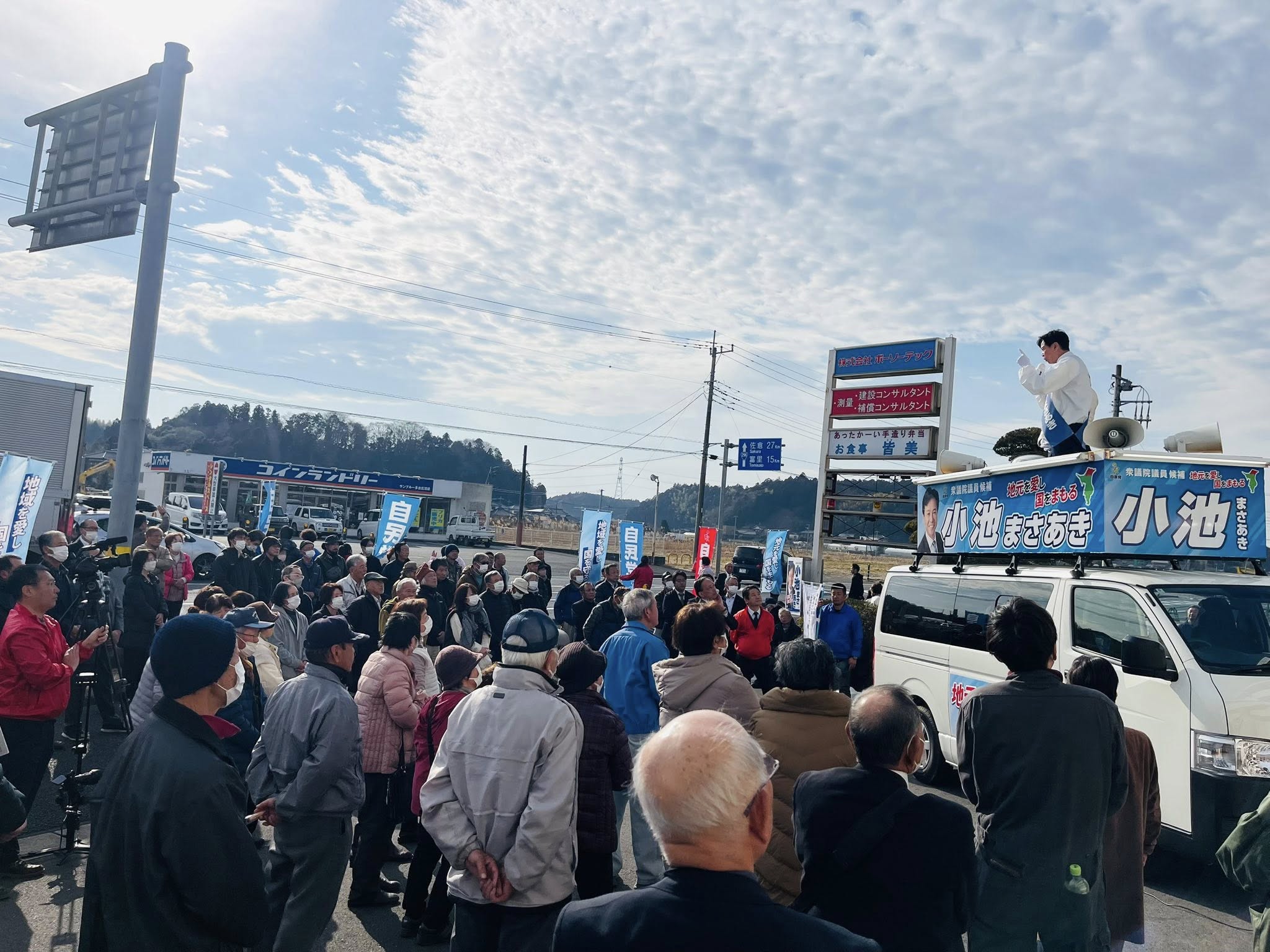 移動の合間には、小池正昭候補の動画撮影も実施。その後、多古町へと向かい、各大臣を歴任された斎藤健・自民党千葉県連会長をお迎えしての街頭演説会が開催されました。