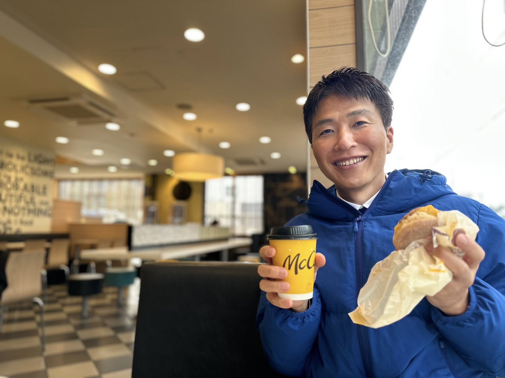 選挙期間中の慌ただしさもあって4㎏減だったので、駅頭活動後はマクドナルドで朝食を。