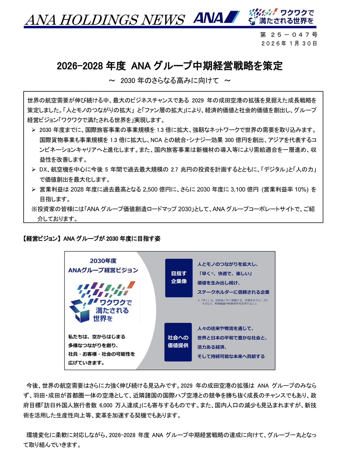 両社とも2030年度までに国際線の旅客・貨物事業の規模を2025年度比で約1.3倍に拡大する方針を示しています。