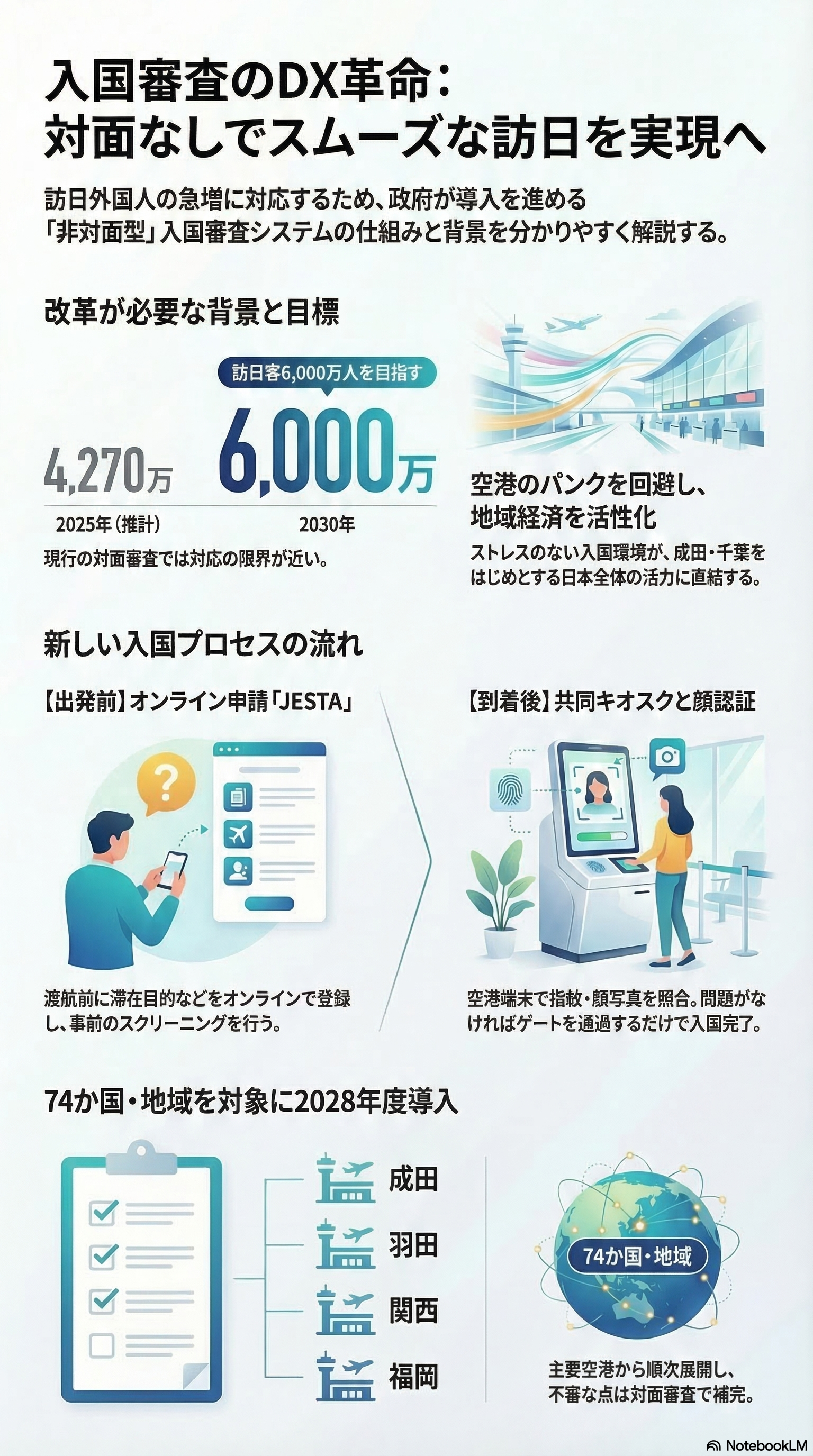 背景にあるのは訪日客の急増。2025年の訪日客数は推計約4,270万人と過去最多を更新し、政府は2030年に6,000万人という目標を掲げていますが、現行の対面審査体制のままでは、空港がパンクしかねないという現実的な課題意識がこの改革の出発点となっています。