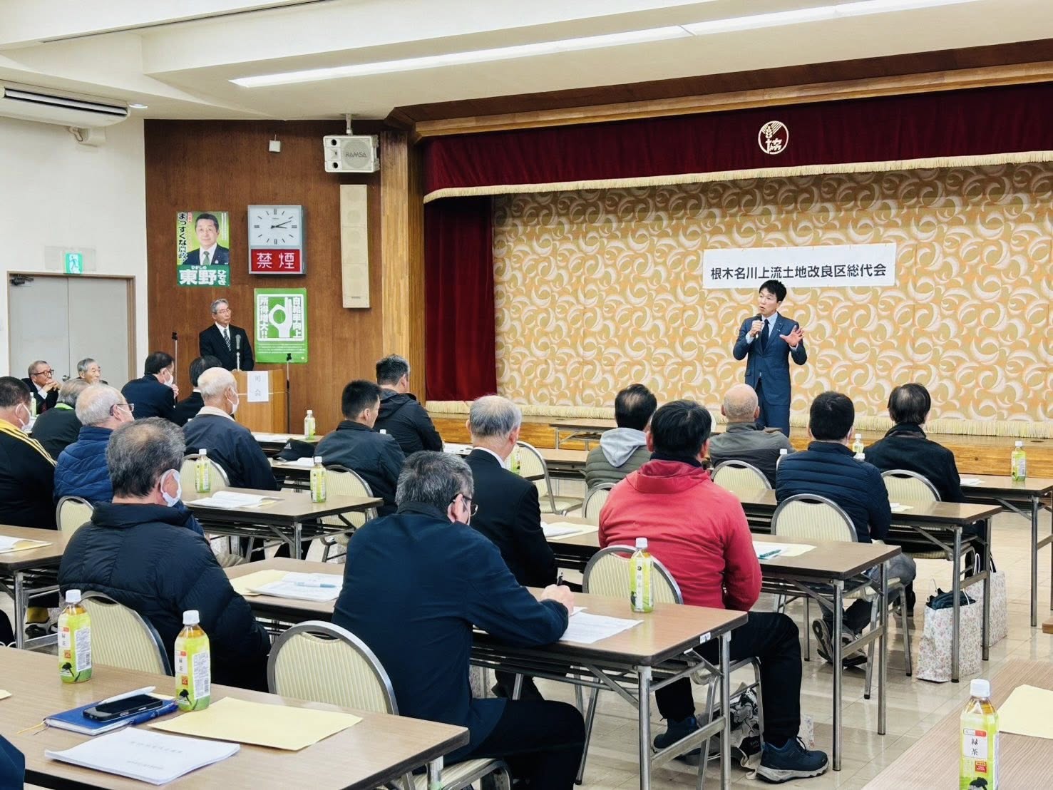 そして、昨日になりますが根木名川上流土地改良区総代会、今日午後からは根木名川土地改良区総代会にそれぞれお招きいただきました。