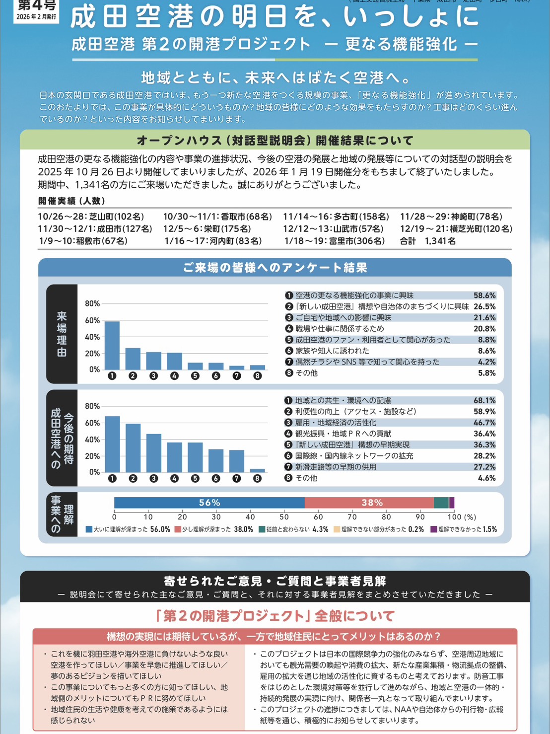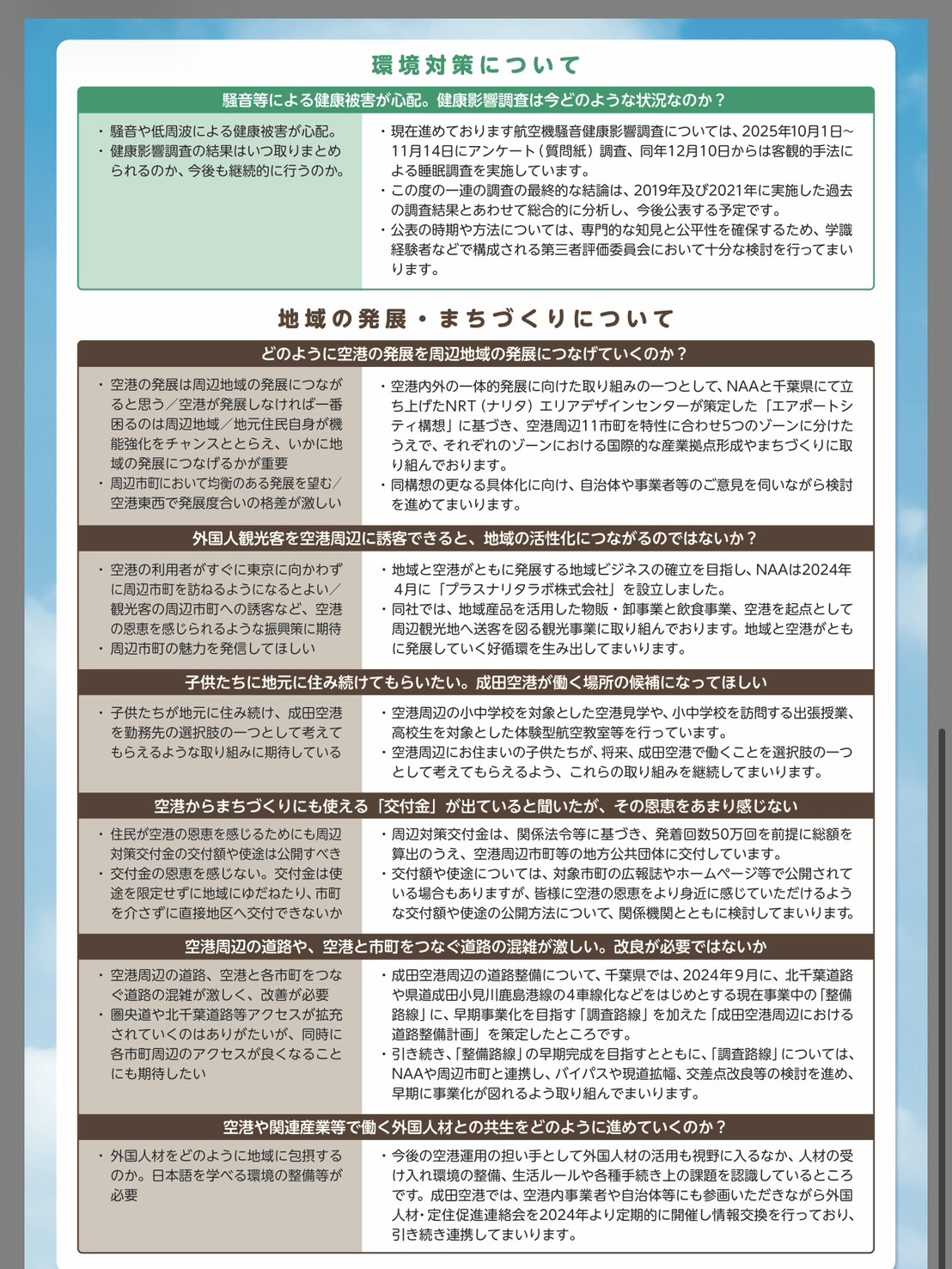 国土交通省航空局、千葉県、成田市、芝山町、多古町、そしてNAAが共同で発行するこのリーフレットも、今号で4号目となります。空港拡張事業の進捗だけではなく、住民から寄せられたリアルな声とそれへの回答が丁寧に掲載されており、読み応えのあるチラシになっています。
