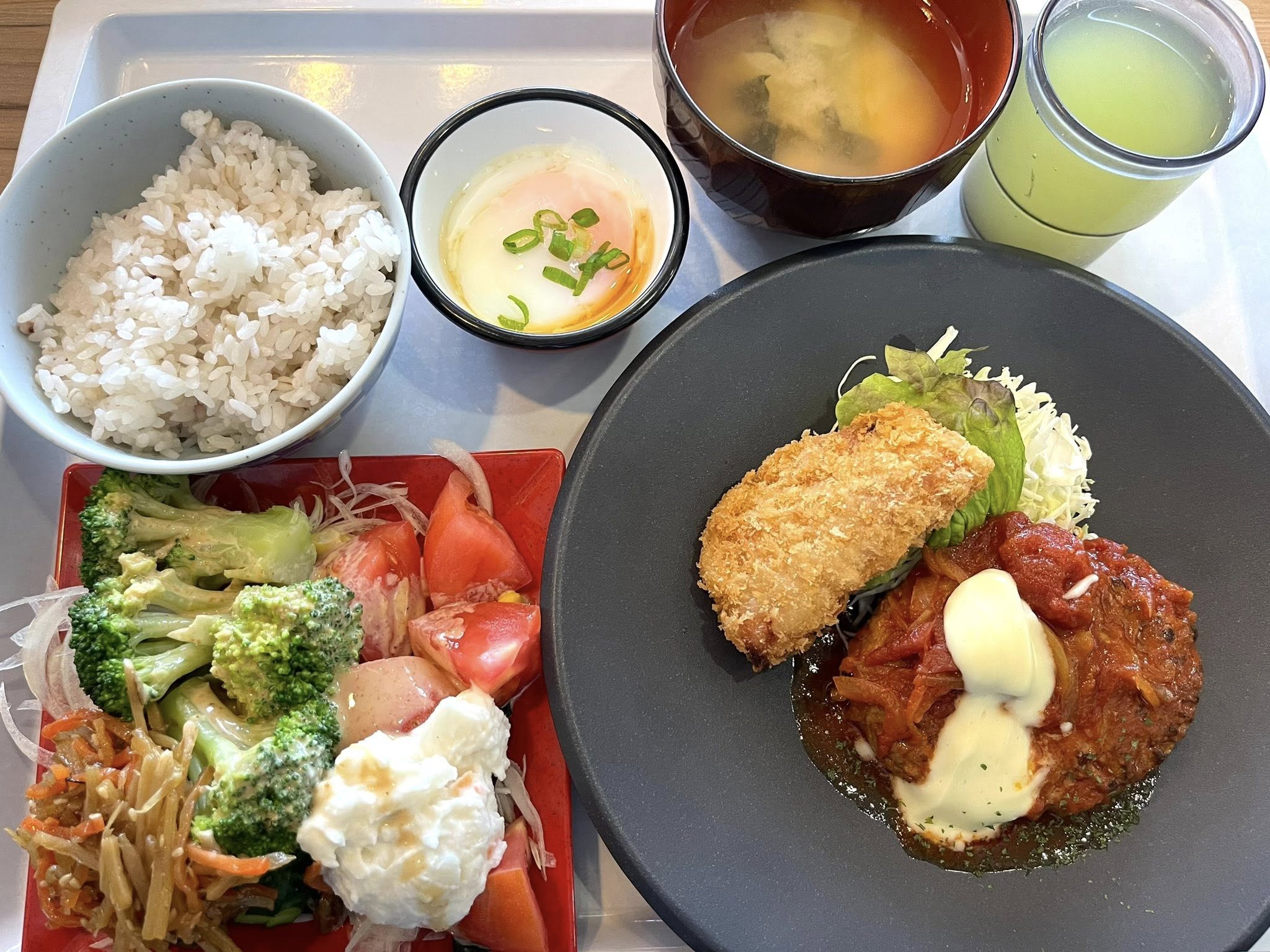 そんな一日の楽しみは、やっぱりランチタイム。ミーティングがてら県庁内のスカイレストラン黎明で、Aランチのトマトチーズハンバーグランチをいただきました。