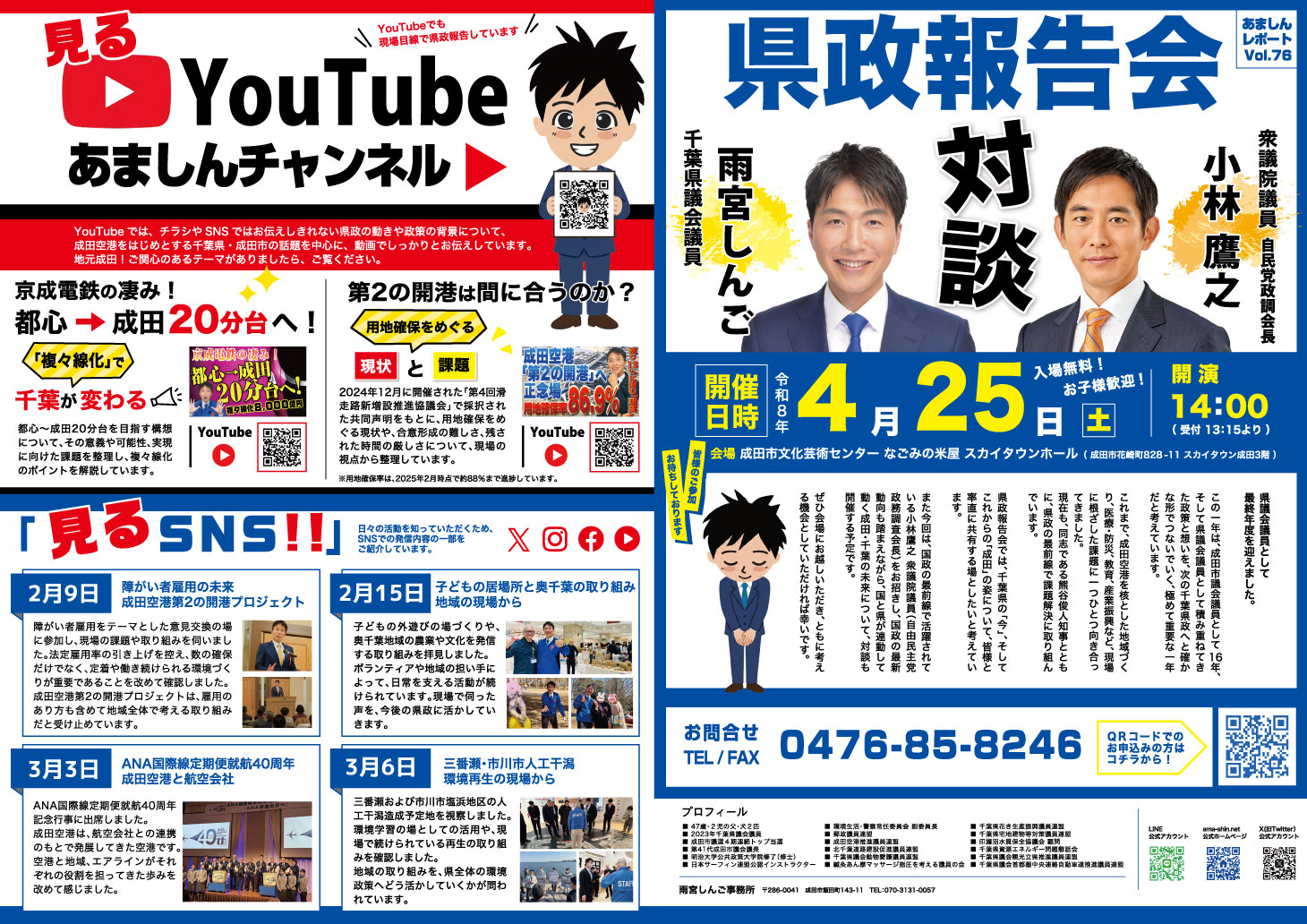 表面では、4月25日に開催する県政報告会のご案内や、YouTube・SNSでの発信内容も紹介しています。どうしても紙面だけでは伝えきれない部分は、動画や日々の発信で補うようにしています。