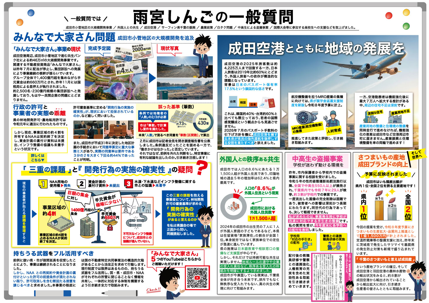 裏面では、主に一般質問で取上げた内容を掲載しており、成田市小菅地区における大規模開発、いわゆる「みんなで大家さん事業」では、開発の規模、事業スキーム、県・市の許認可の考え方、そして私が県議会で投げかけた疑問点を、図解を交えながらまとめています。